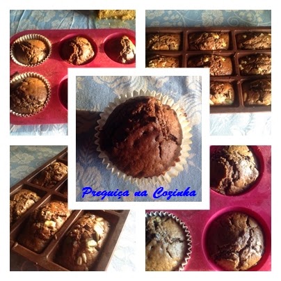 Como cá por casa somos gulosos, acrescentei toda a chávena de chocolate ao preparado e para decorar e colocar no meio parti pequenos pedaços de chocolate de leite e chocolate branco. Também, em alguns, pus nozes trituradas, pinhões e sementes de abóbora.
